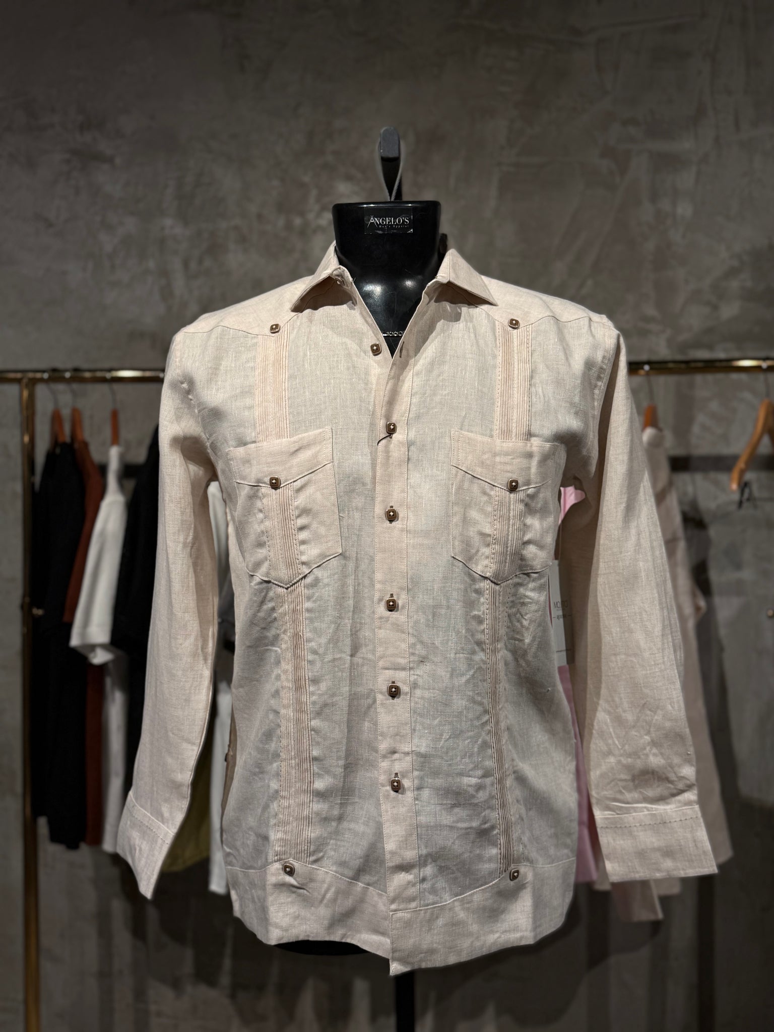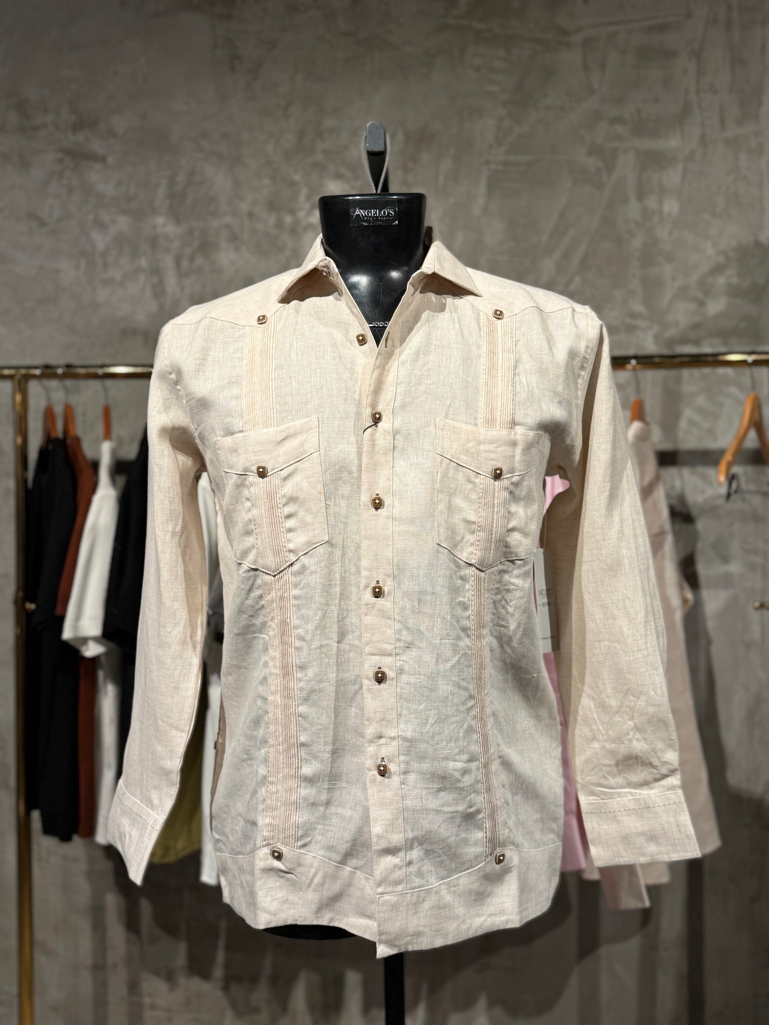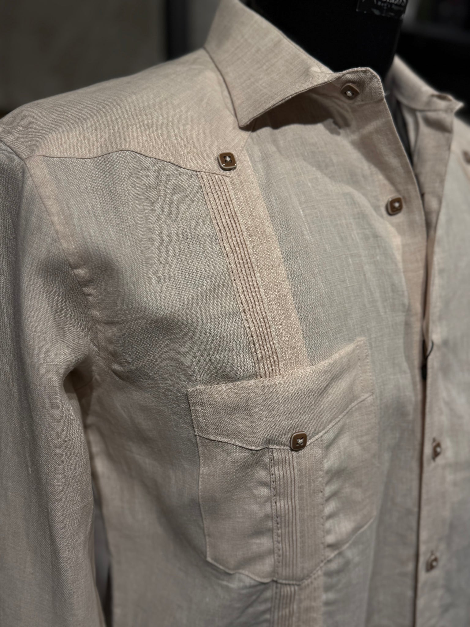 Guayamisa vibrante y sofisticada confeccionada en lino 100%, con detalles estampados en contraste en el interior del cuello, puños y bordes de los bolsillos tipo francés. Su frente con pliegues aporta un guiño a la sastrería latina clásica con un giro moderno. Ideal para bodas, eventos en terrazas y noches cálidas.
